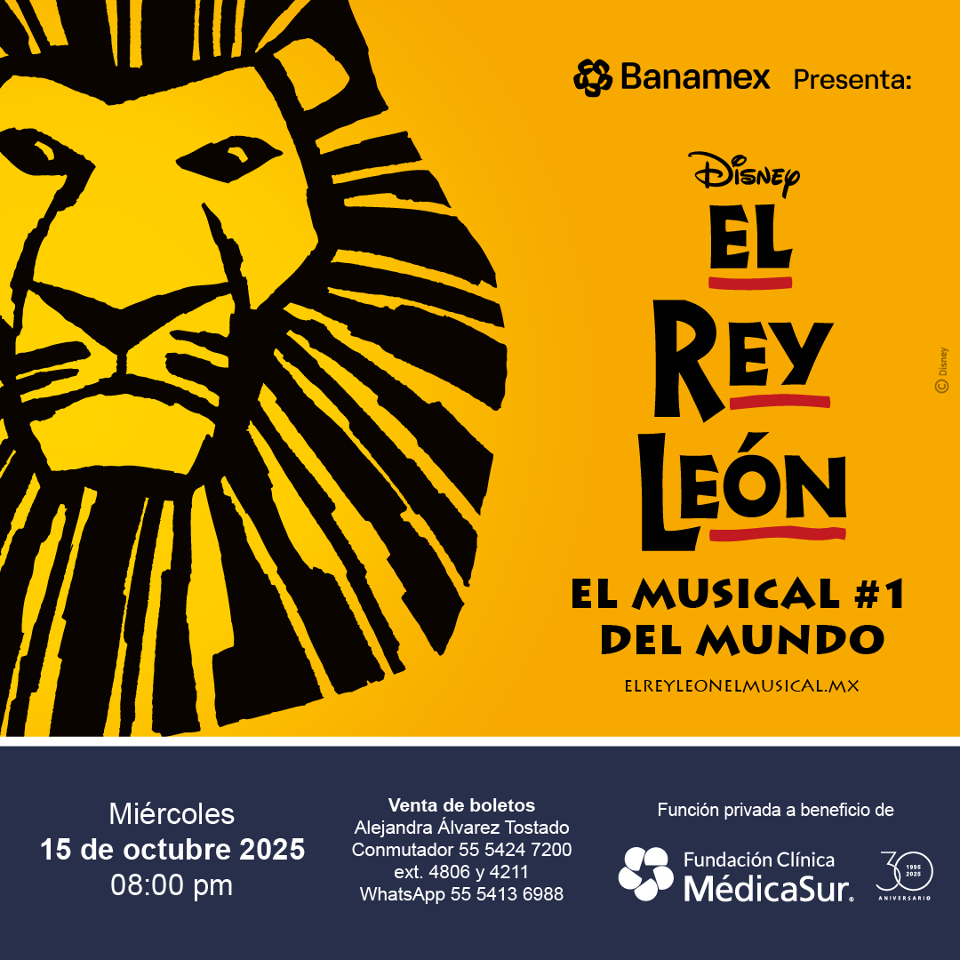 ¡Te invitamos a la función privada del musical "El Rey León" que tendremos en beneficio de la Fundación Clínica Médica Sur, el próximo miércoles 15 de octubre a las 8:00 pm en el teatro Telcel en Plaza Carso!