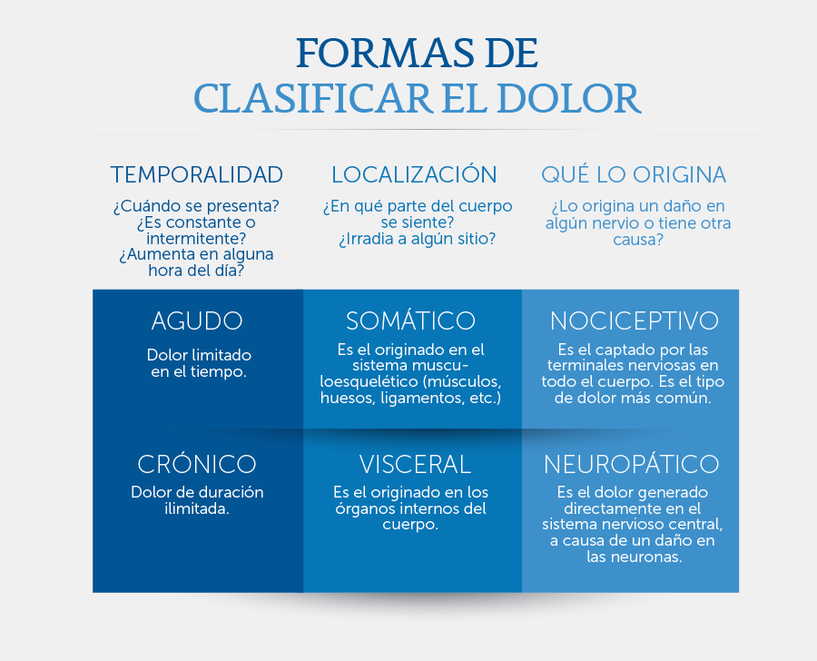 La exploración física y los estudios del grado de extensión de la enfermedad, brindan un panorama que permite al médico identificar qué tipo de dolor (también llamado síndrome doloroso) presenta el paciente, y si se trata de un solo tipo, o de dos o más.