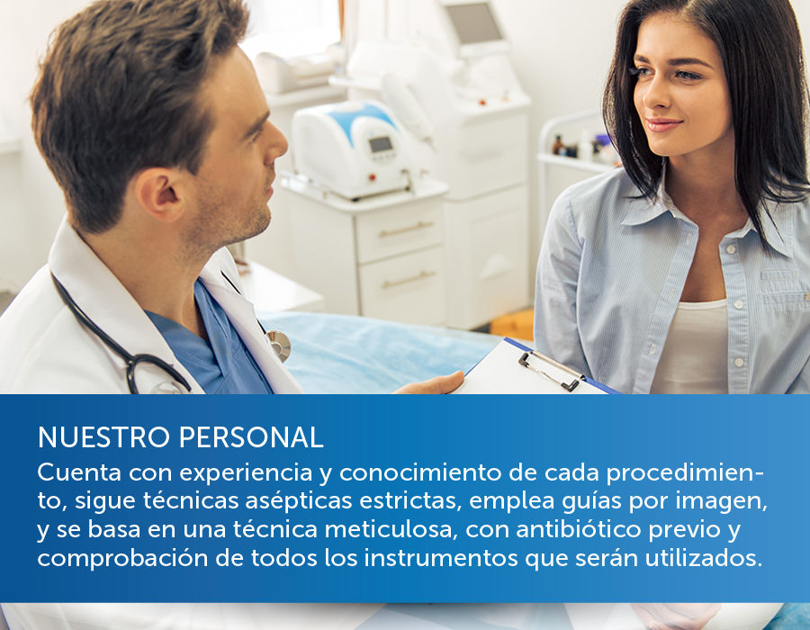 Hacemos una inspección en el sitio en el que haremos la punción a través de la que trabajaremos, para descartar infección o úlceras de decúbito (por ejemplo, las causadas en la espalda por largos periodos en cama), o si existe alguna otra contraindicación.