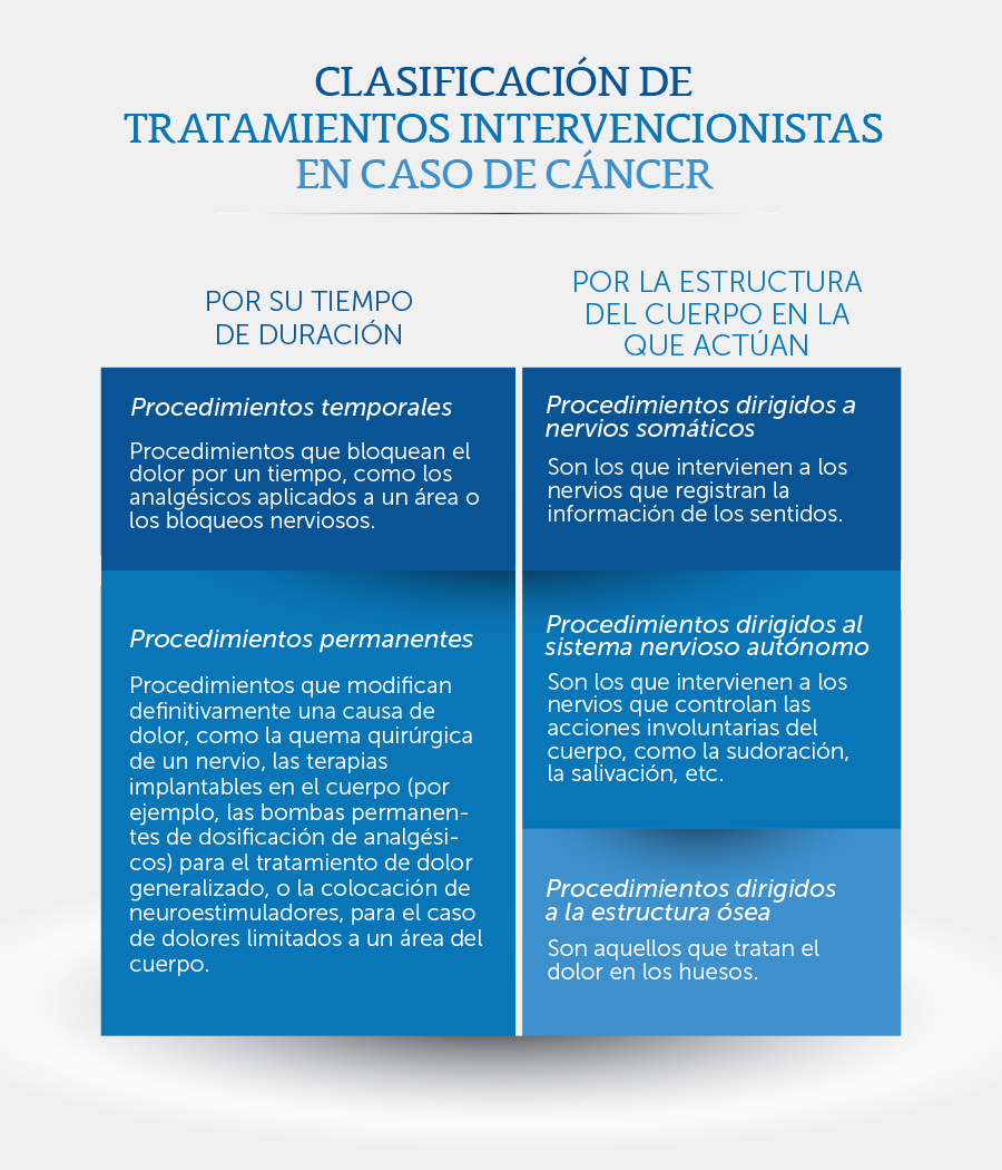 Los tratamientos del dolor en cáncer pueden clasificarse por el lugar del cuerpo en el que actúan o por la duración de su efecto. Estos dos factores deben considerarse al momento de elegir el tratamiento más adecuado.