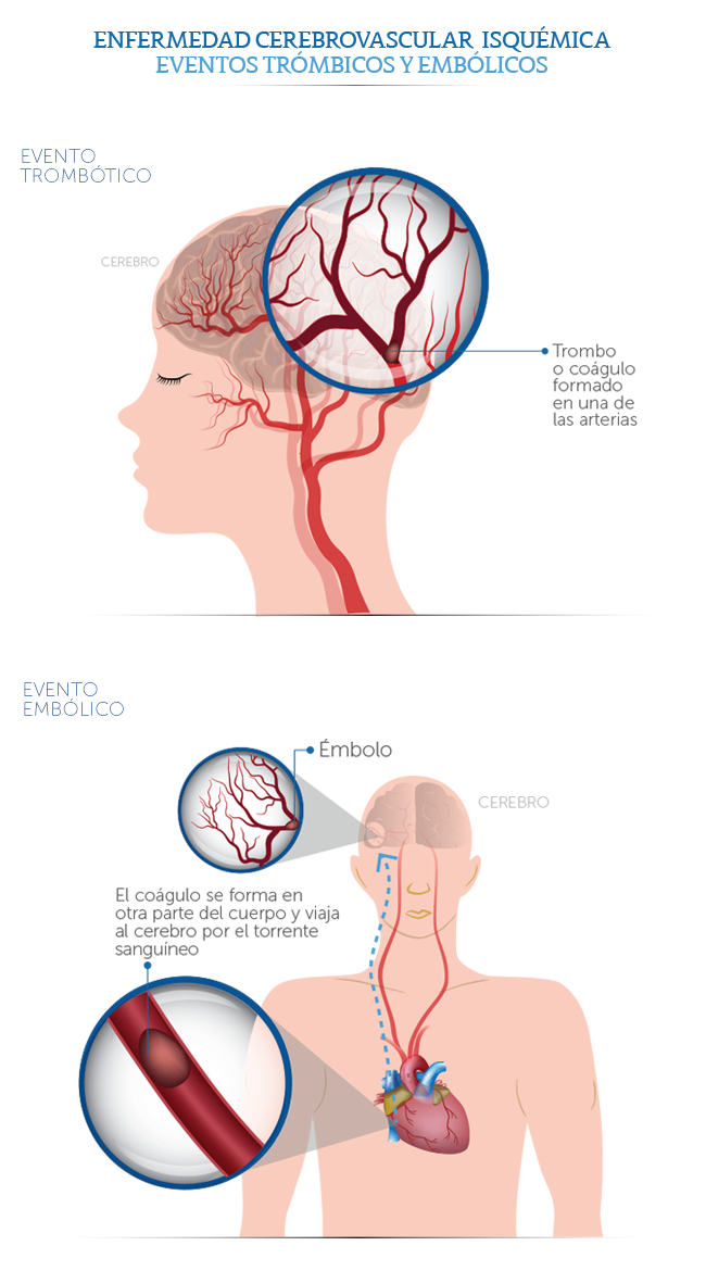 • Eventos trombóticos: un infarto trombótico ocurre cuando un coágulo (también llamado trombo) se forma en alguna de las arterias que llevan sangre al cerebro. El coágulo puede estar formado por depósitos de grasa en las arterias o por otras alteraciones que impiden o limitan seriamente el paso de la sangre.