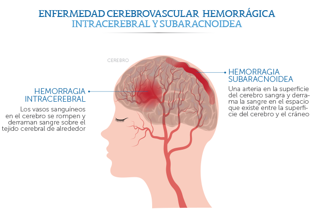 • Hemorragia intracerebral: los vasos sanguíneos en el cerebro se rompen y derraman sangre sobre el tejido cerebral que está alrededor, causando daño en las neuronas de esa área y en aquellas que están más allá de la zona de sangrado, ya que les deja de llegar sangre y por lo tanto sufren daño también. La hipertensión arterial descontrolada, golpes, malformaciones vasculares y el uso de anticoagulantes pueden ser, entre otras, la causa de estos sangrados.